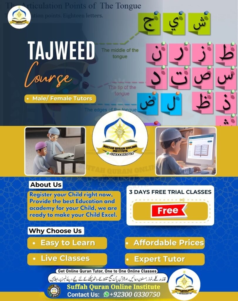 ✅ The term Tajweed means to read the Holy Quran in a beautiful and refined manner. The pronunciation of the letter “with all the attributes” from the “makharij” prescribed by the experts is called Tajweed.